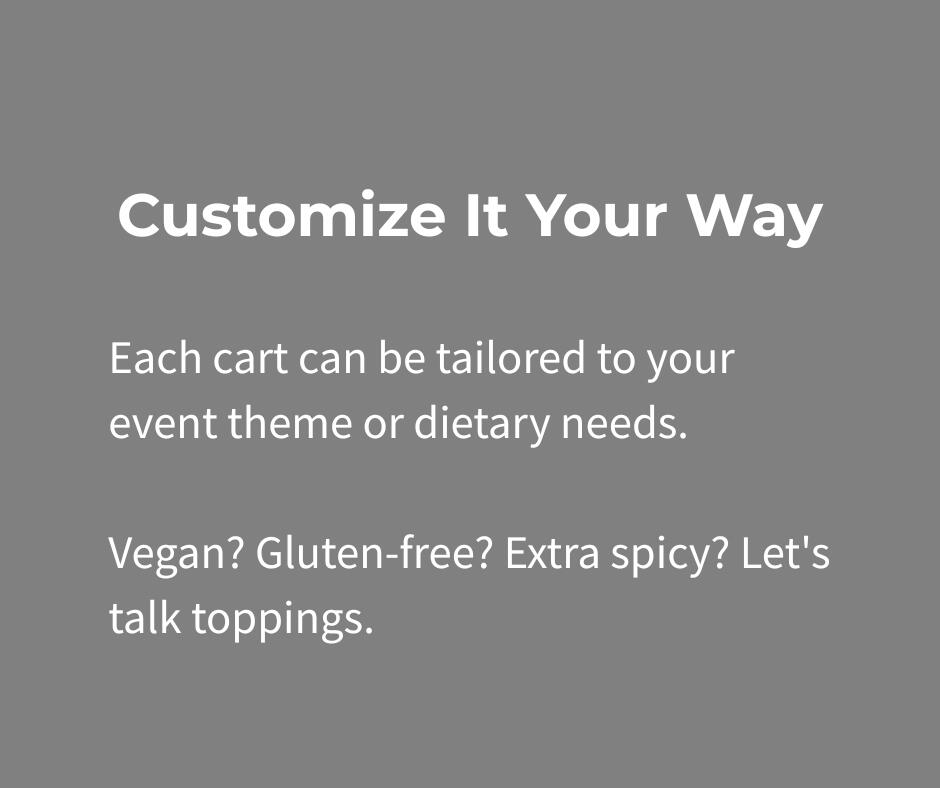 The Rolling Spread is a mobile food cart experience crafted for life's best moments—from corporate events and weddings to birthdays, brunches, and everything in between. Our sleek rolling cart is fully portable, fits almost anywhere, and is designed to serve delicious, crowd-pleasing food with style.We believe food should be fun, flavorful, and unforgettable. That’s why we offer a unique, customizable menu served fresh from our beautifully branded cart. Locally owned and operated, all food is prepared in a licensed kitchen with the highest quality ingredients and care.Whether you’re hosting an intimate gathering or a large-scale celebration, let us roll up and take your event to the next level.